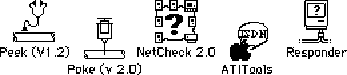 v Poke: Das AppleTalk-Poke-Programm erlaubt es, bis zu zehn LAP-, DDP- und ATP-Pakete zu definieren und wiederholt auf das Netzwerk zu senden. In einer Dialogbox werden die Parameter für jedes Paket definiert.