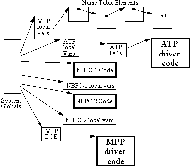 Die Datenstrukturen des AppleTalk im Speicher sind stark zerklüftet (vgl. Abb. B.1.6). Manche Datenblöcke sind über globale Variablen erreichbar[10]. Ein großer Teil ist jedoch undokumentiert und sollte daher auch nicht verwendet werden. Jeder Treiber besitzt lokale Variablen und Datenblöcke. Für die Implementierung eines alternativen Link Access Protocols sind vor allem die lokalen Variablen des .MPP von Bedeutung.