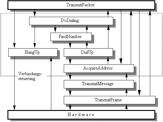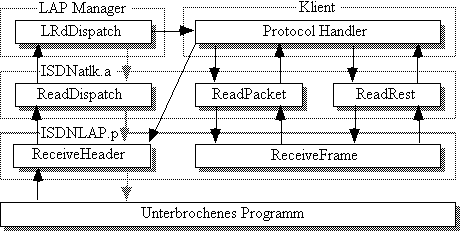 v Ankommende Pakete müssen von einem Interrupt Handler entgegengenommen und anhand des Paketkopfes an den LAP Manager weitergereicht werden. Für das weitere Einlesen muß das ISDNLAP die Prozeduren ReadPacket, ReadRest des ALAP durch eigene Prozeduren ersetzen.