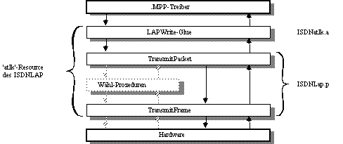 Aus Gründen der besseren Wartbarkeit und Übersichtlichkeit wurde versucht, den Großteil des ISDNLAP in Pascal zu implementieren. Da die Schnittstelle zum LAP Manager „register based“ ist, werden Glueroutinen, die in Pascal entweder nicht implementiert werden können oder in Assembler einfacher zu realisieren sind, in M68000-Assembler codiert. Erhebliche Schwierigkeiten entstehen auch, wenn sich am Anfang eines Codes eine Sprungtabelle befindet. Die Erfahrung hat gezeigt, daß es oft mühsamer ist, Glueroutinen als Inline-Statements oder als „tricky Pascal code“ zu implementieren als direkt in Assembler. Zudem erzeugt jeder Compiler anderen Objektcode und belegt andere Register.