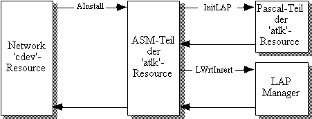 v Der LAPWrite-Code im ATalkHk2 muß durch eine neue Sendeprozedur substituiert werden, die sich nahtlos in den AppleTalk Protocol Stack einfügt.