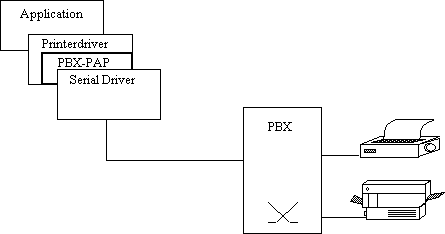 Der Macintosh erlaubt es, über ein Hilfsprogramm, den sog. Chooser, verschiedene Druckertreiber auszuwählen. Ein modifizierter Druckertreiber sorgt dafür, daß die Druckausgabe direkt über das ISDN-Netz an den Drucker geschickt wird. Treiber sind beim Macintosh-Betriebssystem als Resourcen vorhanden. So ist es möglich, nur Teile von Programmen zu modifizieren oder zu ersetzen. Dem Druckertreiber wird anstelle des Codes, der über AppleTalk druckt, eine Prozedur zur Übertragung über V.24 und PBX eingesetzt. Der Verbindungsauf- bzw. Verbindungsabbau geschieht explizit durch das Öffnen und Schließen des Druckertreibers (transaktionsorientiert).