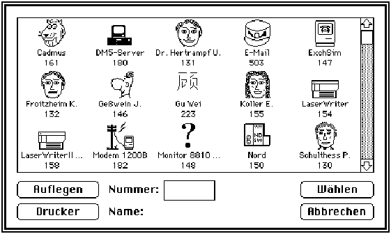 Das Deskaccessory übernimmt die Verbindungssteuerung zu Geräten, die an das Netzwerk angeschlossen sind. Durch das Deskaccessory „Wählen“ wird bei IBM-kompatiblen Rechnern sichergestellt, daß normale, unveränderte Applikationen ohne besondere Treiber über das Netzwerk drucken können. Der Verbindungsaufbau geschieht kurz bevor die normale Druckfunktion durch das verarbeitende Programm abläuft. Zur Auswahl des Kommunikationspartners dient ein Menü von Namen, Telefonnummern und Icons (vgl. Abb. 5.1.4). Die benötigten Informationen befinden sich in einem Telefonbuch auf der lokalen Platte, das für alle beteiligten Computer gleich sein soll und von einem Server geholt werden kann. Zu den im Telefonbuch gespeicherten Daten gehören neben dem Namen, der Nummer und dem Icon des jeweiligen Teilnehmers auch Informationen über die Art des Endgerätes (Dienstekennung), die Schnittstellenkonfiguration und eventuell Login-Parameter[6]. Das Deskaccessory für den Macintosh ermöglicht zusätzlich die Auswahl eines Laserdruckers im Netz, indem die Nummer des Druckers in die PAPA-Resource eingetragen wird[7].