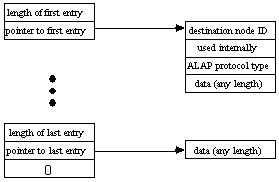 Die Prozedur LAPWrite benutzt eine besondere Datenstruktur, in der Pakete verpackt sind, die Write Data Structure (WDS)[13]. Diese enthält ein oder mehrere Segmente von Daten, die ein Paket ergeben. Die Struktur besteht aus einer Anzahl von Längen und Zeigerpaaren, die die einzelnen Segmente beschreiben. Die Länge ist jeweils ein Wort und der Zeiger, der auf das erste Zeichen des Segments verweist, ein Doppelwort. In einer WDS können mehrere solche Längen- und Zeigerpaare vorhanden sein, abgeschlossen werden sie immer durch ein Nullwort (siehe Abb. 5.2.2).