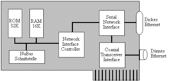 Die Karte enthält 32 kByte ROM und 16 kByte Video-RAM. Das RAM ist in einen Sende- und Empfangspuffer, und diese wiederum sind in 256 Byte große Speicherblöcke unterteilt. Das ROM enthält eine weltweit eindeutige 48-Bit-Ethernet-Adresse und die NuBus-Software. Über einen Steckverbinder auf der Platine kann zwischen dem dünnen und dem Standard-Ethernet gewählt werden. Der Transceiver für das dünne Ethernet ist auf der Platine vorhanden, für das Standard-Ethernet wird ein externer Transceiver über ein Kabel mit einem DB 15-Stecker angeschlossen.