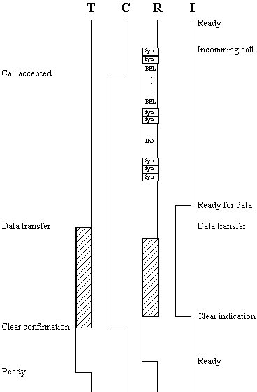 Ein ankommender Anruf wird bei der angerufenen DTE durch eine Sequenz von SYN-Zeichen, gefolgt von BEL-Zeichen, signalisiert (Abb. 7.2.3). Nimmt eine DTE einen ankommenden Anruf entgegen, so zeit sie das dem Netz an, indem sie das Control-Signal vom OFF- in den ON-Zustand versetzt. Hierauf sendet das Netz der DTE auf der Receive-Leitung Dienstsignale und die Anschlußkennung. Anschließend signalisiert das Netz durch das Senden von 1-Bits, daß die Verbindung im Aufbau ist. Sobald die Verbindung steht, zeigt das Netz der DTE durch Versetzen des Indicate-Signals vom OFF- in den ON-Zustand an, daß es bereit ist, Daten entgegenzunehmen und an die Gegenseite der Verbindung zu übertragen.