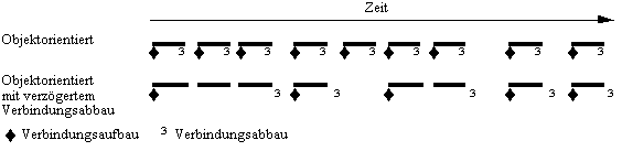 Die retardierende objektorientierte Verbindungssteuerung läßt eine Verbindung nach der Übertragung eines Paketes noch für kurze Zeit bestehen. Abgebaut wird sie erst dann, wenn während dieser Zeit kein weiteres Paket an dieselbe Adresse übertragen oder empfangen wurde (Abb. 7.4.1). Zusätzlich kann eine Verbindung durch die Gegenstation abgebrochen werden. Da es sehr wahrscheinlich ist, daß mehrere Pakete unmittelbar hintereinander an dieselbe Adresse zu übertragen sind, bewirkt diese Strategie eine erhebliche Reduzierung der notwendigen Verbindungen[17] (vgl. hierzu Abb. 7.4.1).
