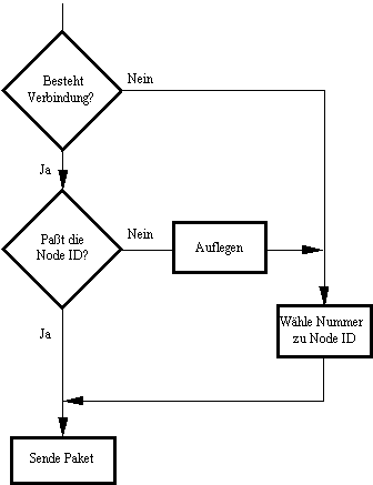 Im Detail funktioniert die Verbindungssteuerung wie folgt: Bevor eine Station ein Paket sendet, prüft sie, ob bereits eine Verbindung besteht. Besteht keine Verbindung, so wird die Rufnummer zur Zieladresse des Paketes gewählt. Andernfalls wird geprüft, ob das zu sendende Paket an den Knoten adressiert ist, zu dem die Verbindung besteht. Unterscheiden sich die Adressen, so muß die bestehende Verbindung abgebrochen und die der Zieladresse entsprechende Rufnummer gewählt werden. Schließlich wird das Paket übertragen. Dieses Schema verdeutlicht das Flußdiagramm in Abbildung 7.4.2.