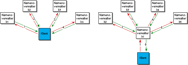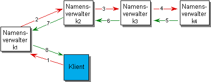 Eine mögliche Variante der iterativen Auflösung globaler Namen besteht im Kontaktieren eines regionalen Namensverwalters durch den Klienten, wobei der Name vom regionalen Namensverwalter aufgelöst wird und nur das endgültige Resultat der Anfrage an den Klienten zurückgegeben wird. Der Vorteil dieses Vorgehens besteht darin, daß durch das Vorhalten einmal aufgelöster Namensteile im regionalen Namensverwalter diese auch für die Auflösung von Namen durch andere Klienten zur Verfügung stehen.