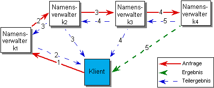 [3] Die Ziffern in Abbildung 4.4, Abbildung 4.5 und Abbildung 4.6 kennzeichnen die Abfolge der Nachrichten bei der Auflösung von Namen.
