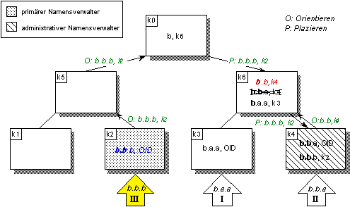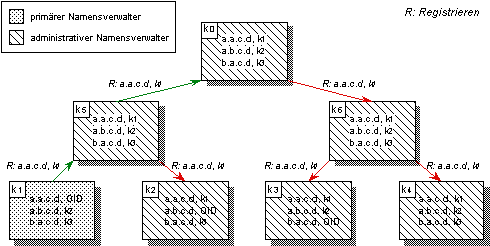 Um die vollständige Erkundung des Verwalternetzes bei der vollständigen Verteilung und den zusätzlichen hohen Speicherbedarf der totalen Replikation von Namenseinträgen zu vermeiden, bietet sich zunächst eine Vorgehensweise an, bei der jeder Namensverwalter entweder Kopien seiner primären Namenseinträge oder Namenseinträge mit Navigationsinformation für von ihm verwaltete Namenseinträge an übergeordnete Namensverwalter weitergibt (vgl. Abbildung 4.11). Dadurch befinden sich in den Namensbasen übergeordneter Namensverwalter jeweils die Vereinigungsmengen der Namensinformationen untergeordneter Namensverwalter.