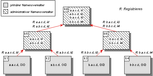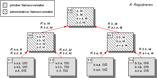 Eine entscheidende Frage bei der Registrierung hierarchischer Namen ist die Art der globalen Verteilung hierarchischer Namensräume auf die verwaltenden Instanzen im hierarchischen Verwalternetz (vgl. Abbildung 4.8).