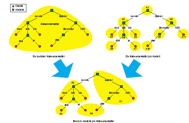 Das vorangegangene Kapitel hat gezeigt, wie hierarchische, synonyme und attributierte Namen unabhängig von physikalischen oder organisatorischen Strukturen selbständig und ohne Administration in globalen Namensräumen verwaltet werden.