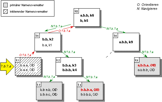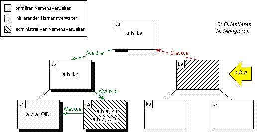 Der folgende Abschnitt stellt strukturorientierte Auflösungsverfahren vor, die basierend auf der Interpretation des gesuchten Namens und der Navigationsinformation in Namensverwaltern Anfragen gezielt an den zuständigen Namensverwalter im Verwalternetz leiten. Die Navigationsinformation in Namensverwaltern gibt an, über welche Verbindung eine Partition des globalen Namensraums erreicht wird. Durch die Interpretation des Namens während der Auflösung und mit Hilfe von Navigationsinformation kann die Erkundung des Verwalternetzes gezielt gesteuert werden. Dieses Vorgehen, das auch als Navigation im Verwalternetz verstanden wird und hier nur im Ansatz formuliert ist, soll in den nächsten Abschnitten weiter präzisiert werden.