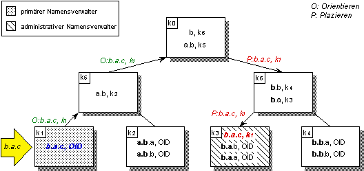 Durch die hierarchische Organisation des Namensraums und der Namensverwalter kann die Zahl der zur Namensauflösung erforderlichen Navigationsschritte reduziert werden, indem Namenseinträge mit Navigationsinformation syntaxgesteuert im Verwalternetz plaziert werden. Die maximale Hierarchiestufe, auf der Namenseinträge in der Verwalterhierarchie positioniert werden, entspricht dabei stets der Anzahl der Namensteile. Die zur globalen Namensauflösung erforderliche Navigationsinformation wird bei der Plazierung der Namenseinträge selbständig erzeugt. Die Bildung von Kontexten reduziert ferner die in den Namensverwaltern zur Lokalisierung primärer Namenseinträge notwendige Navigationsinformation. Die syntaxgesteuerte Plazierung von Namen verhindert ferner, daß übergeordnete Kontexte in unteren Hierarchiestufen entstehen und umgekehrt.