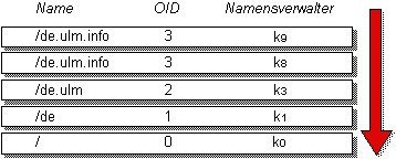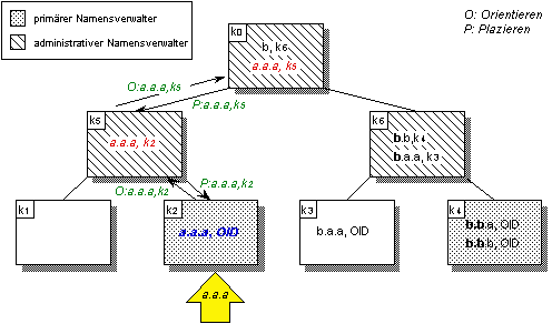 Ein Vorteil der in Abbildung 4.11 vorgestellten Art der Propagierung von Namenseinträgen ist, daß nicht jeder Namensverwalter alle Informationen halten muß. Bei der Auflösung von Namen wird spätestens in der Wurzel der Verwalterhierarchie der gesuchte Namenseintrag oder Navigationsinformation auf den primären Namenseintrag lokalisiert, sofern sich untergeordnete Namensverwalter zur Namensauflösung schrittweise jeweils an den übergeordneten Namensverwalter wenden.