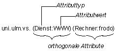 Hierarchische Strukturen können nur in der Art effizient durchsucht werden, in der sie organisiert sind. Sie eignen sich daher nur für die Organisation von Informationen, die entsprechend hierarchisch strukturiert sind. Um eine effiziente globale Lokalisierung von Attributen in hierarchischen Namensräumen zu ermöglichen, bricht die dynamische globale Namensverwaltung daher bei der Registrierung attributierte Namen in hierarchische Teilnamen auf, die zueinander orthogonale Attribute benennen. Orthogonale Attribute mit ihren Werten bilden separate hierarchische Teilbäume im globalen hierarchischen Namensraum, die unabhängig voneinander auf die Verwalterhierarchie abgebildet werden. Der Namensraum wird somit flacher und kann effizienter nach Attributen durchsucht werden (vgl. Kapitel 2). Teilnamen bezeichnen jeweils Teilordnungen von Attributen, deren Reihenfolge nicht vertauschbar ist. Attribute selbst setzen sich aus Attributtyp und Attributwert zusammen: