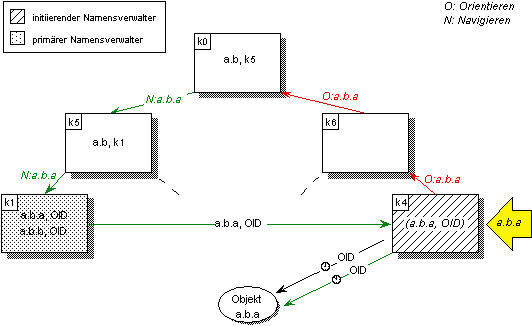 Das Beispiel in Abbildung 5.3 zeigt den Vorgang der transitiven Namensauflösung beim erstmaligen Objektzugriff ¿ und den Rückgriff auf die vorgehaltene Namen-Objekt-Bindung beim wiederholten Objektzugriff ¡. Der in Namensverwalter k4 vorgehaltene Namenseintrag wird in Klammern dargestellt.
