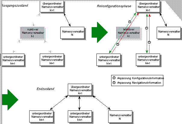 In der Reorganisationsphase wird die Konfigurations- und Navigationsinformation der untergeordneten und des neuen übergeordneten Namensverwalters ki-1 angepaßt. Besondere Behandlung erfordert die Anpassung von Navigationsinformation in Namensverwaltern, die im Verwalternetz dem ausgefallenen Namensverwalter nicht direkt übergeordnet sind, jedoch Namenseinträge mit Navigationsinformation enthalten, die auf den ausgefallenen Namensverwalter verweist. Derartige Navigationsinformation wird durch erneutes Plazieren der zugehörigen Namenseinträge im Verwalternetz wiederhergestellt, sobald ein untergeordneter Namensverwalter den Ausfall erkennt. Anschließend verweist die Navigationsinformation des neuen übergeordneten Namensverwalters ki-1 auf die untergeordneten Namensverwalter ki+1 und die Konfigurationsinformation der Namensverwalter wieder auf den jeweils übergeordneten bzw. untergeordneten Namensverwalter.