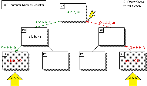 Dem Registrieren von Namenseinträgen geht eine Phase zur syntaxgesteuerten Plazierung voraus, die als eine Art Reservierung verstanden werden kann. Die geschilderte Konkurrenzsituation kann somit vermieden werden, da im obersten Namensverwalter beim Plazieren eine Reservierung für den neuen Eintrag vorgenommen wird, noch bevor er im primären Namensverwalter plaziert ist (vgl. Abbildung 5.10). Ein konkurrierender Versuch zum Plazieren eines Eintrags wird somit in der Orientierungsphase erkannt und abgebrochen. Eine der konkurrierenden Registrierungen wird sich dabei durchsetzen. Voraussetzung hierfür ist, daß das Überprüfen auf das Vorhandensein des Namenseintrags und das Plazieren innerhalb eines Namensverwalters atomar erfolgt.