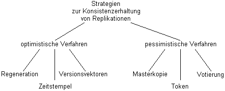 Replikationen haben den Nachteil, daß sie die Komplexität eines Systems erhöhen und aufwendige Verfahren für die Propagierung von Änderungen und zur Konfliktbehebung bei Inkonsistenzen verlangen. Besteht eine geringe Wahrscheinlichkeit des Auftretens von Konflikten, so bieten sich zur Konsistenzerhaltung sog. optimistische Verfahren an. Sind Konflikte hingegen sehr wahrscheinlich, besitzen pessimistische Verfahren Vorteile (vgl. Abbildung 5.14).